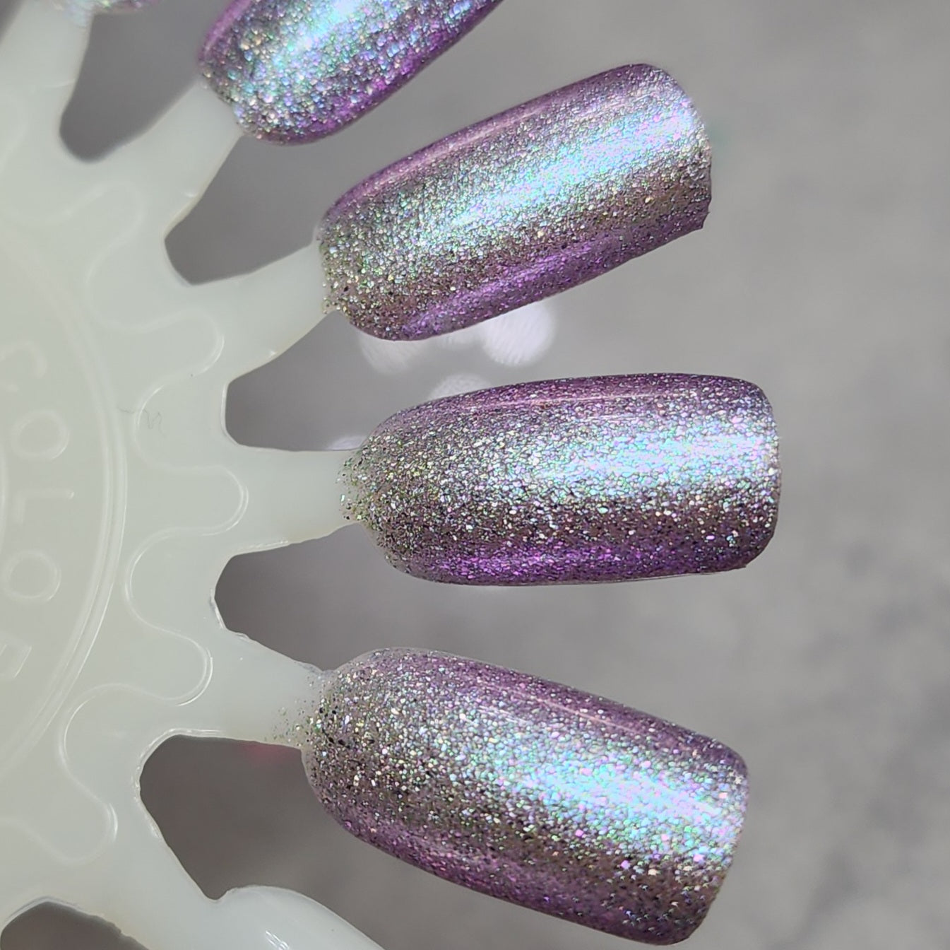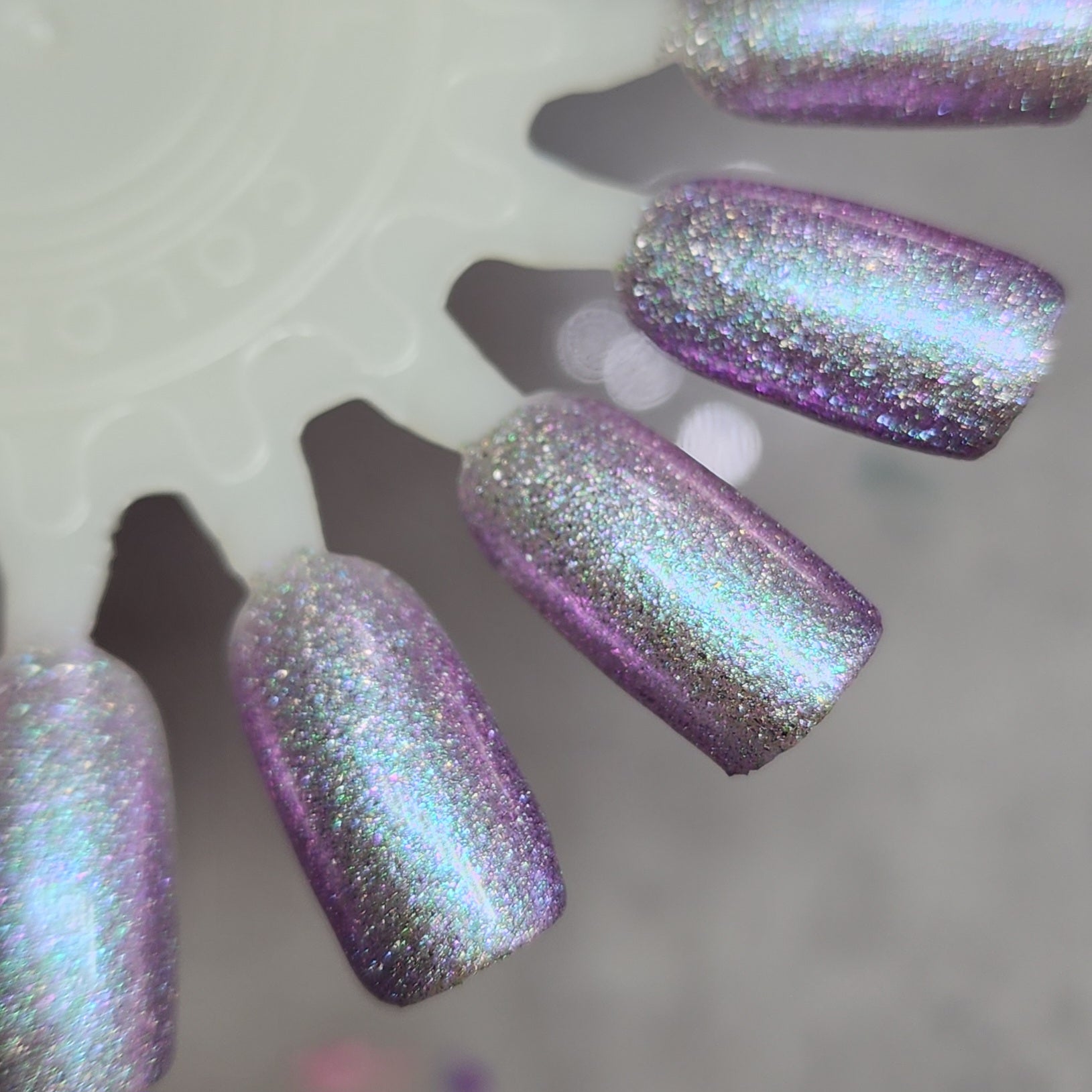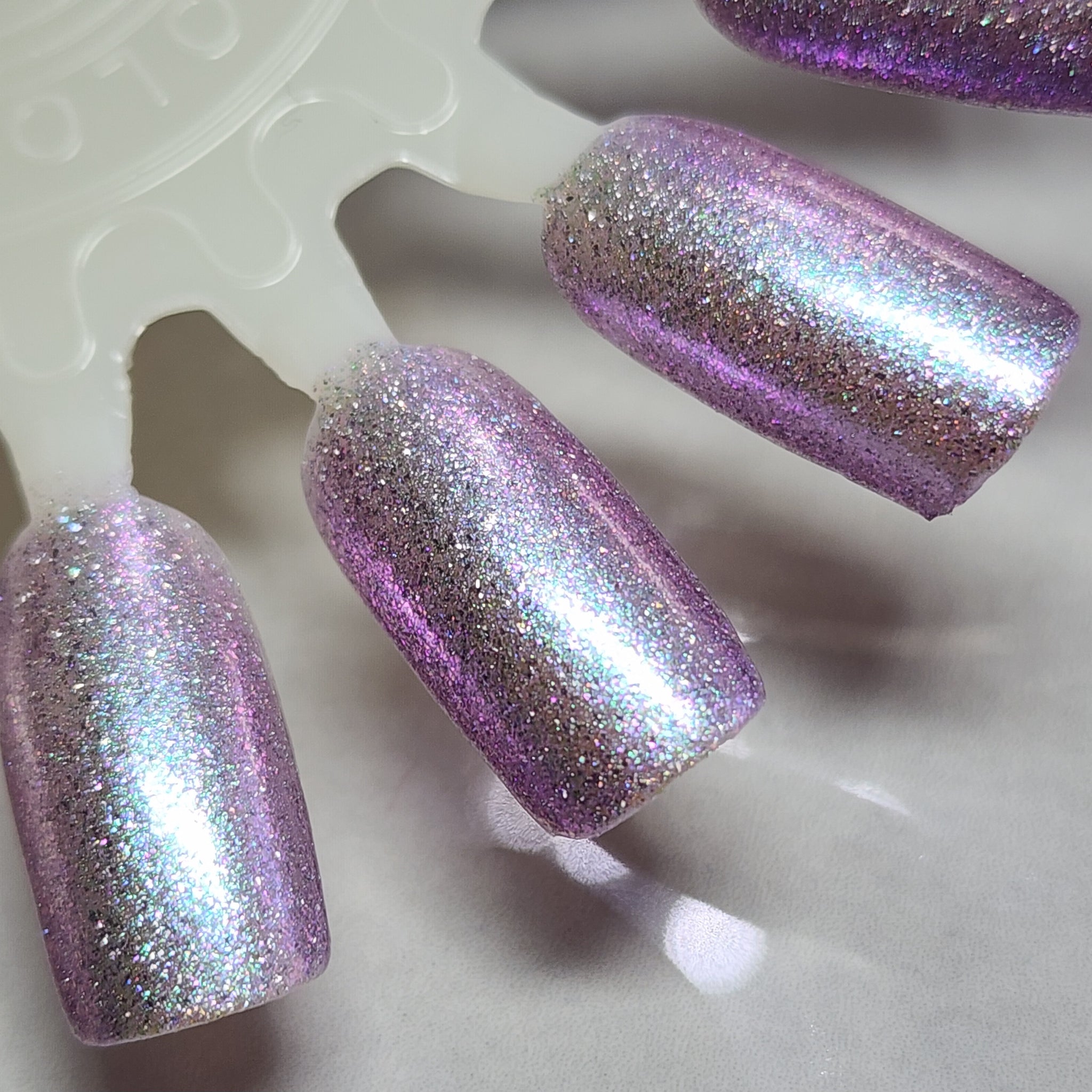 Celestial Snow is a purple tinted holographic base with a teal to purple shifting shimmer and pinky purple sparks.