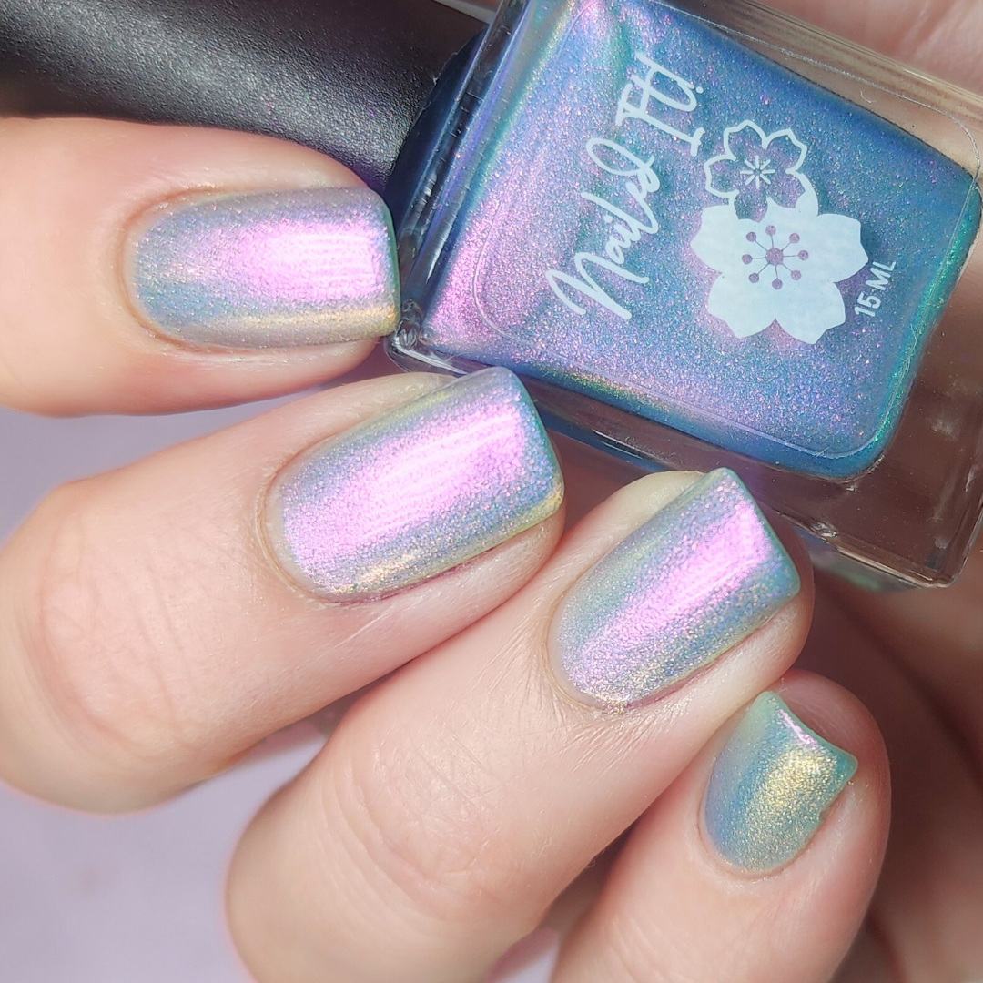 A dreamy, pale blue base with a vibrant pink to gold shifting shimmer.