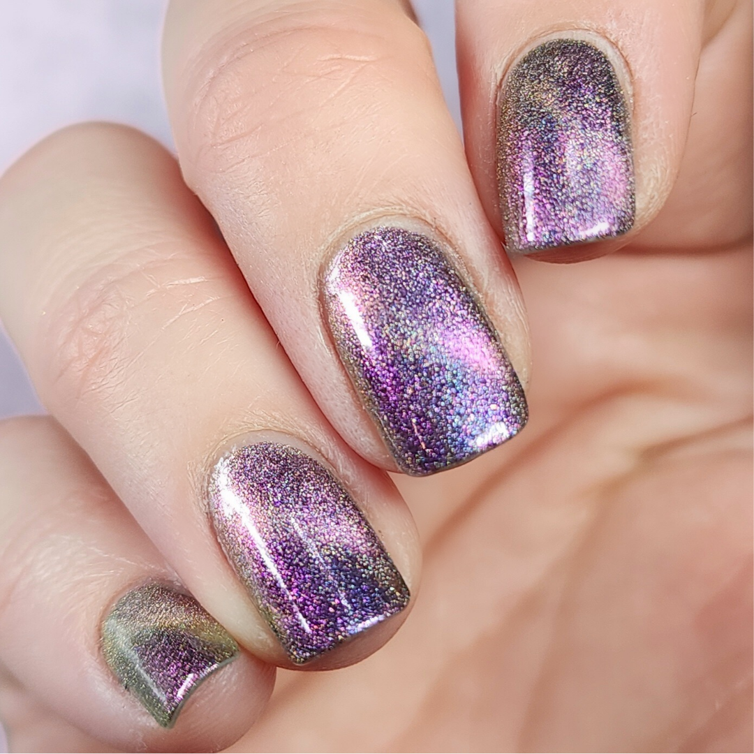 A light pink holographic magnetic polish with a blurple multichrome shimmer and pops of pink aurora.