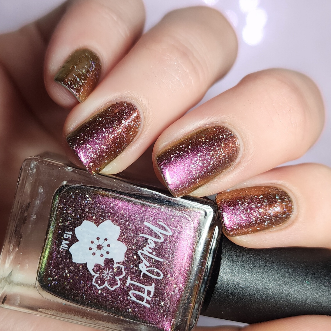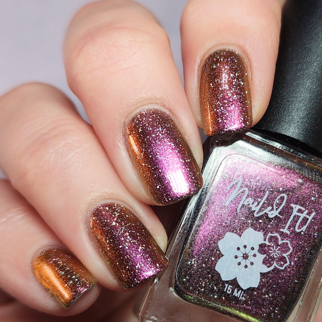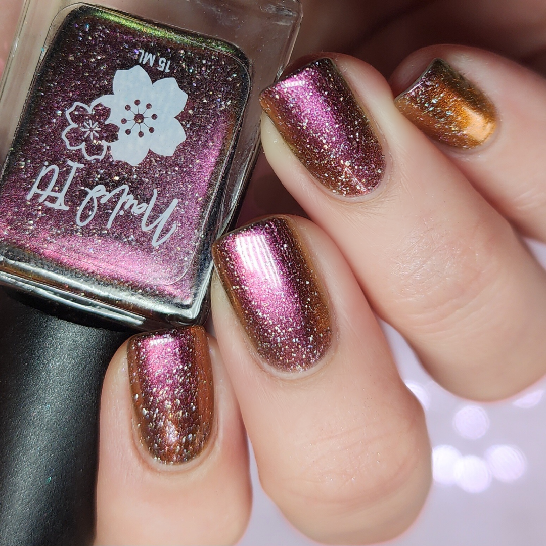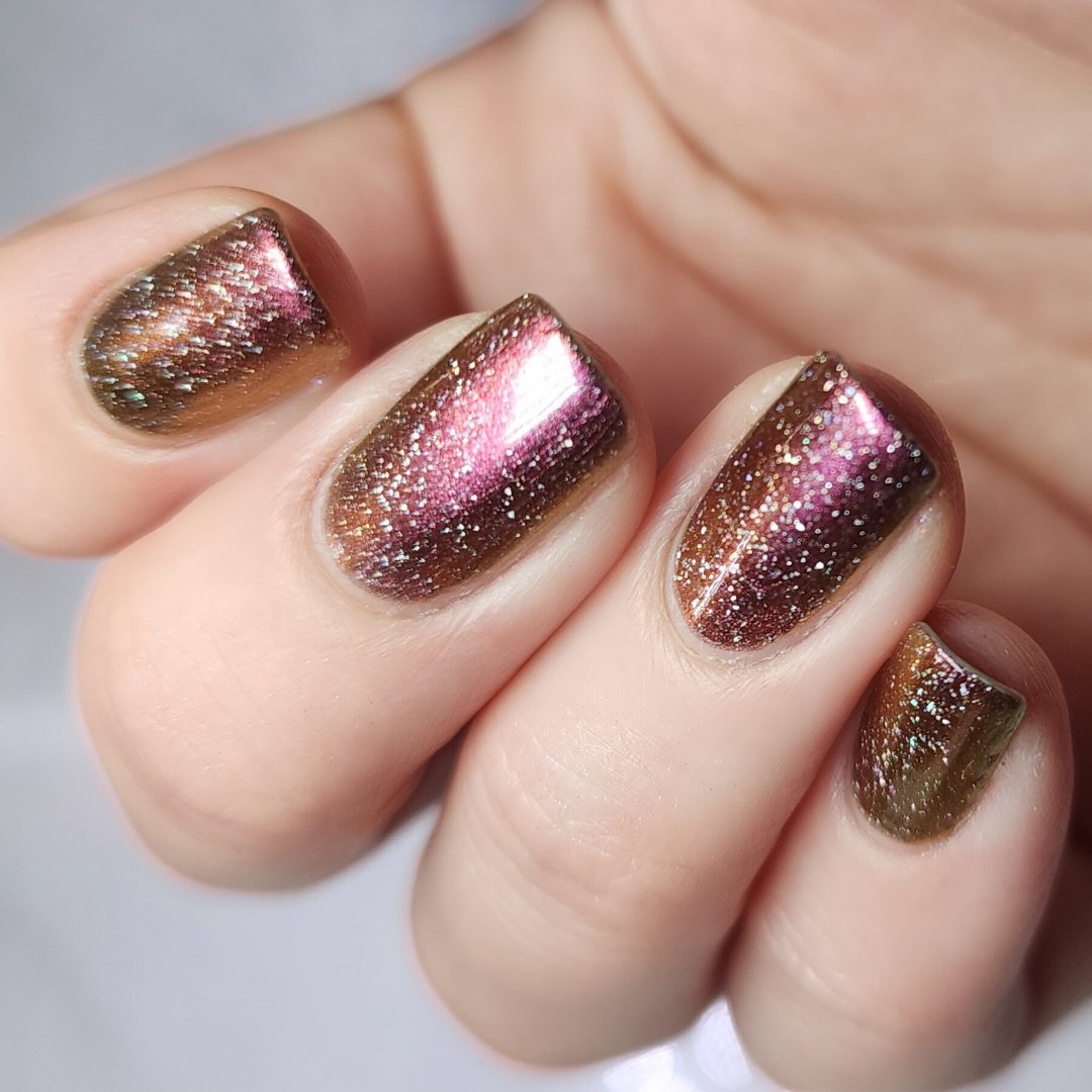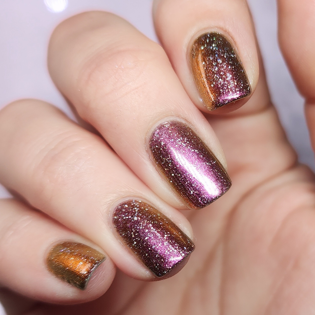 A multichrome that shifts from a deep maroon to fiery orange to warm gold and accented with holo flakies.