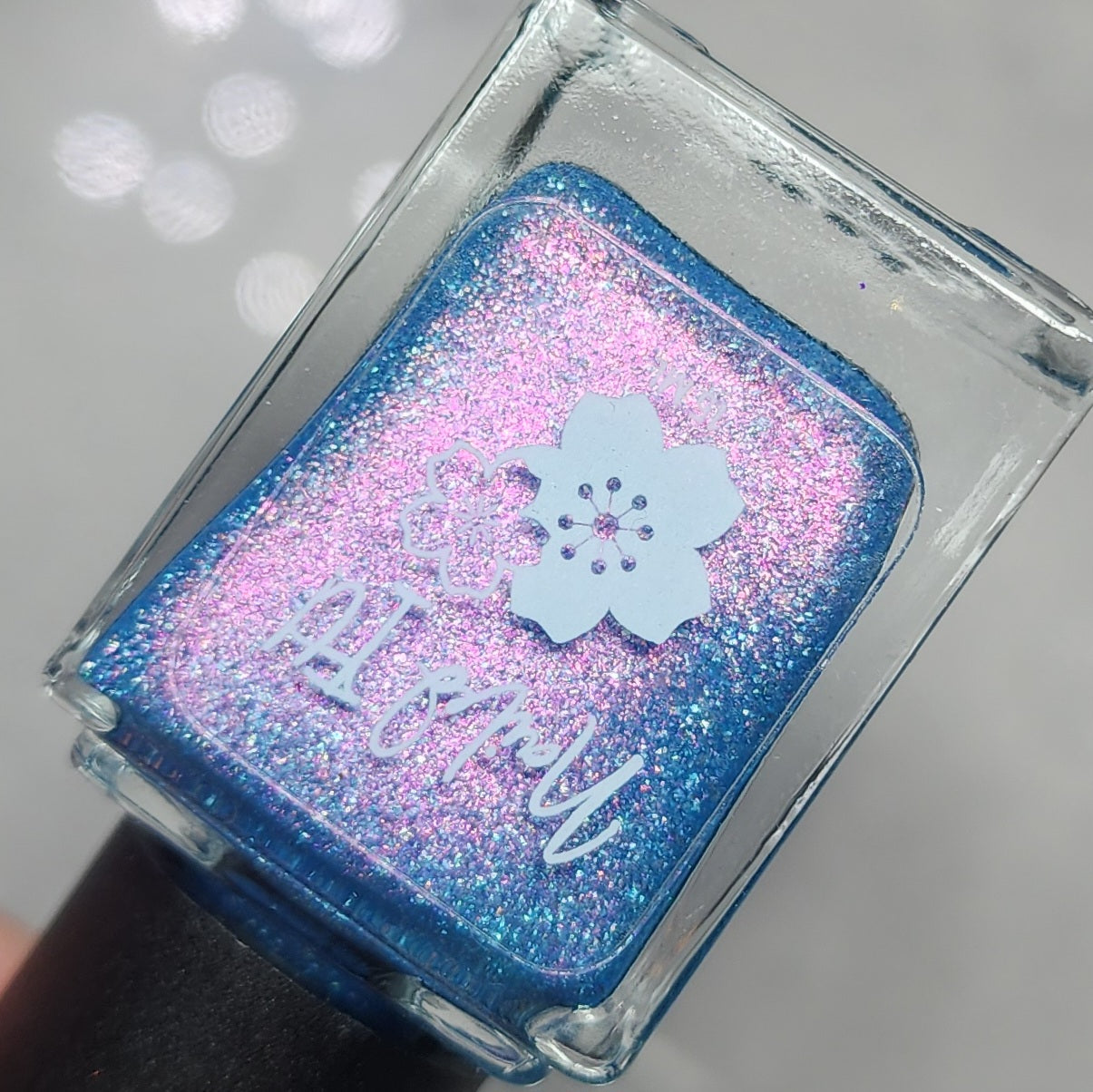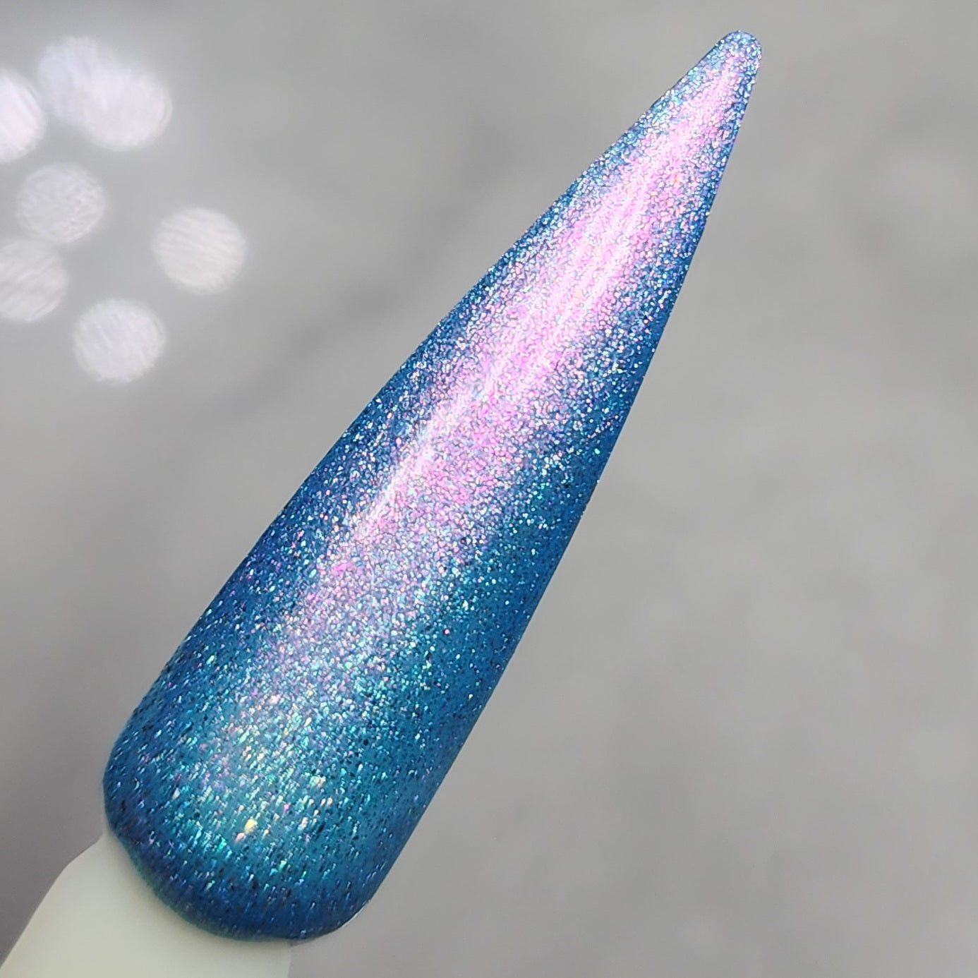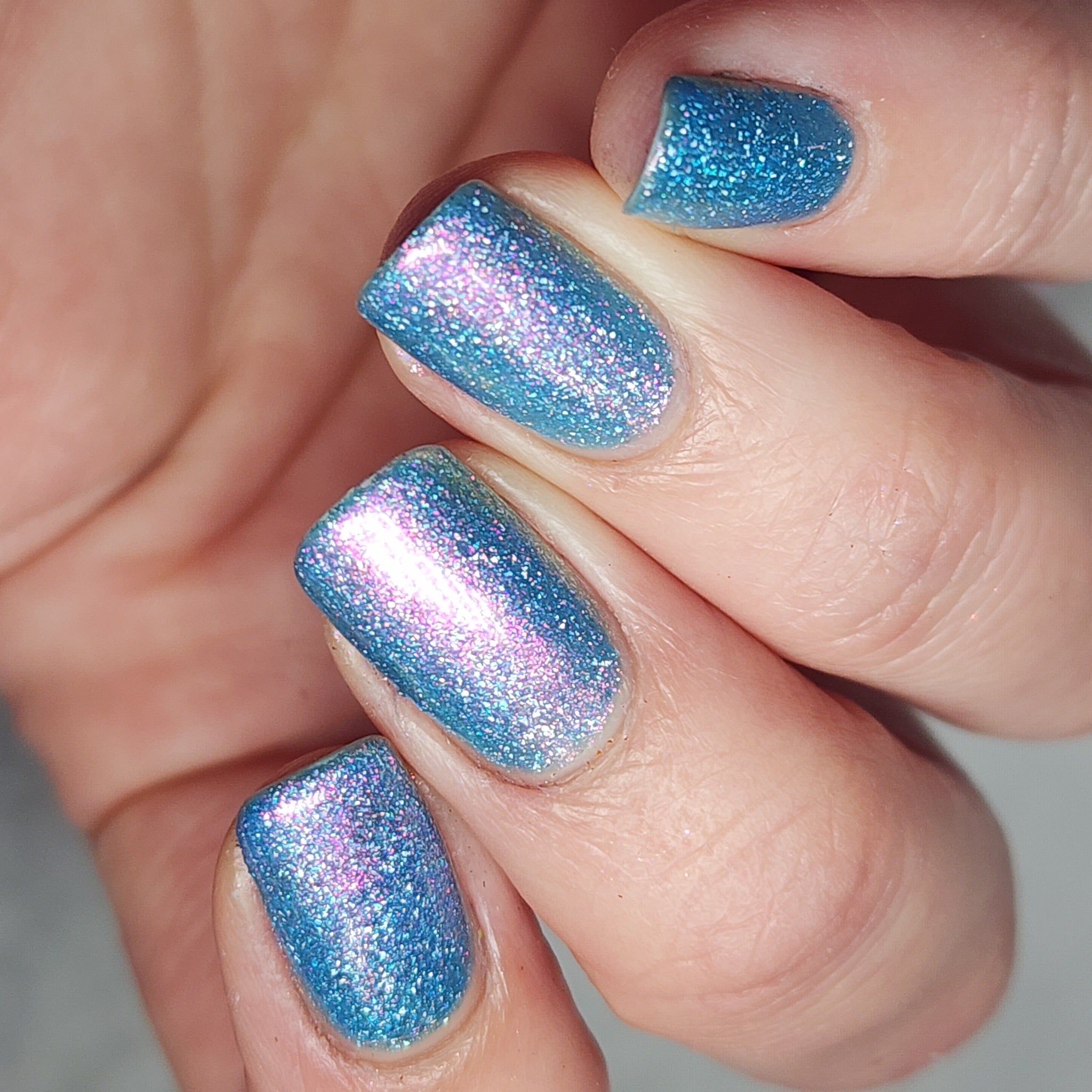 A light blue base packed with holo flakies and a strong pink to gold aurora shimmer.
