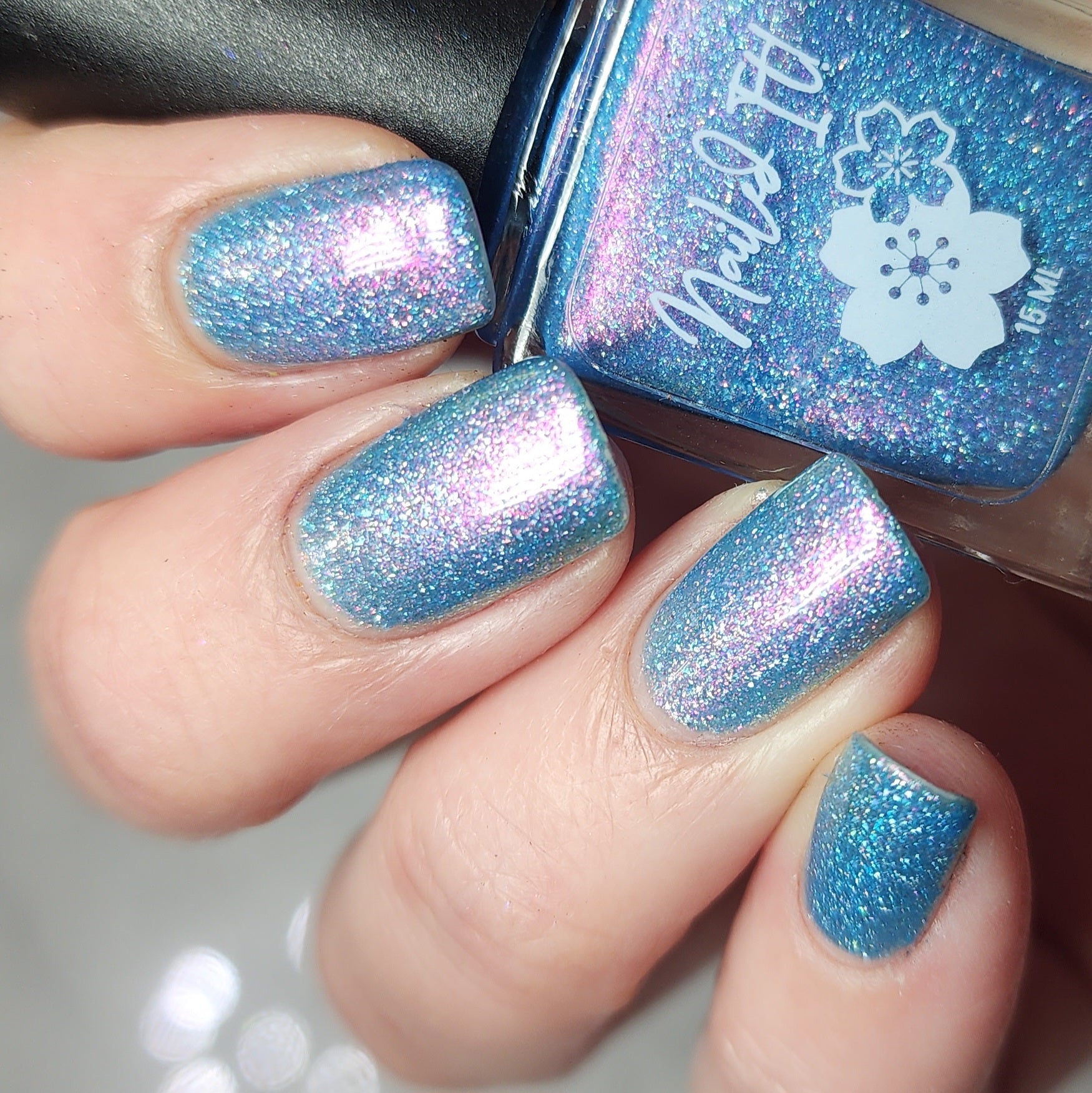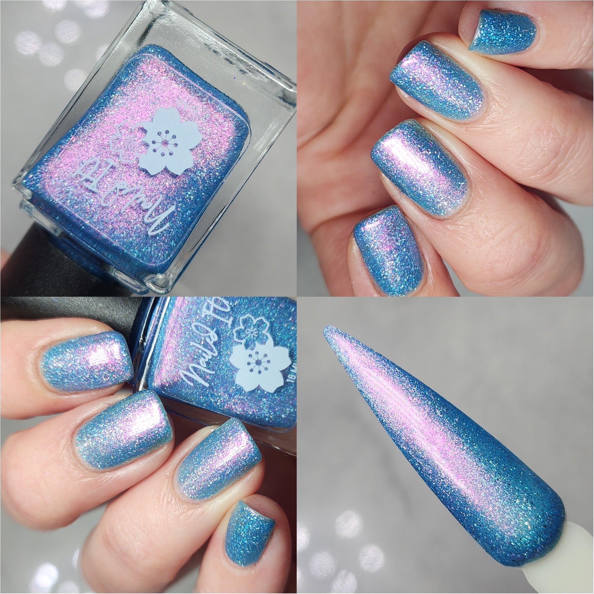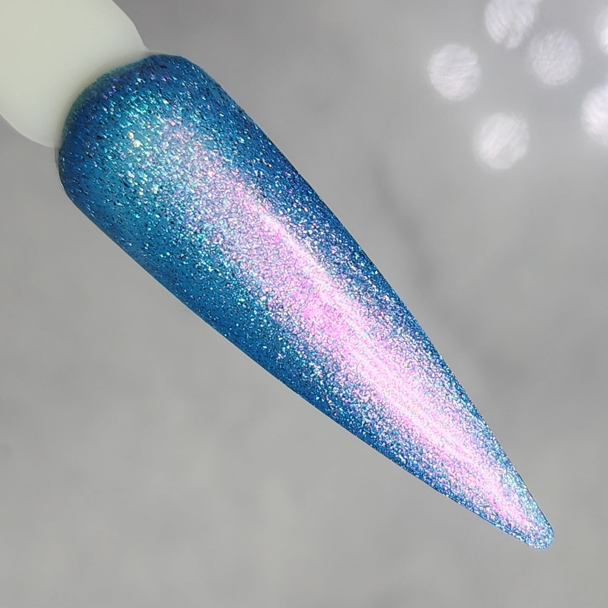 A light blue base packed with holo flakies and a strong pink to gold aurora shimmer.