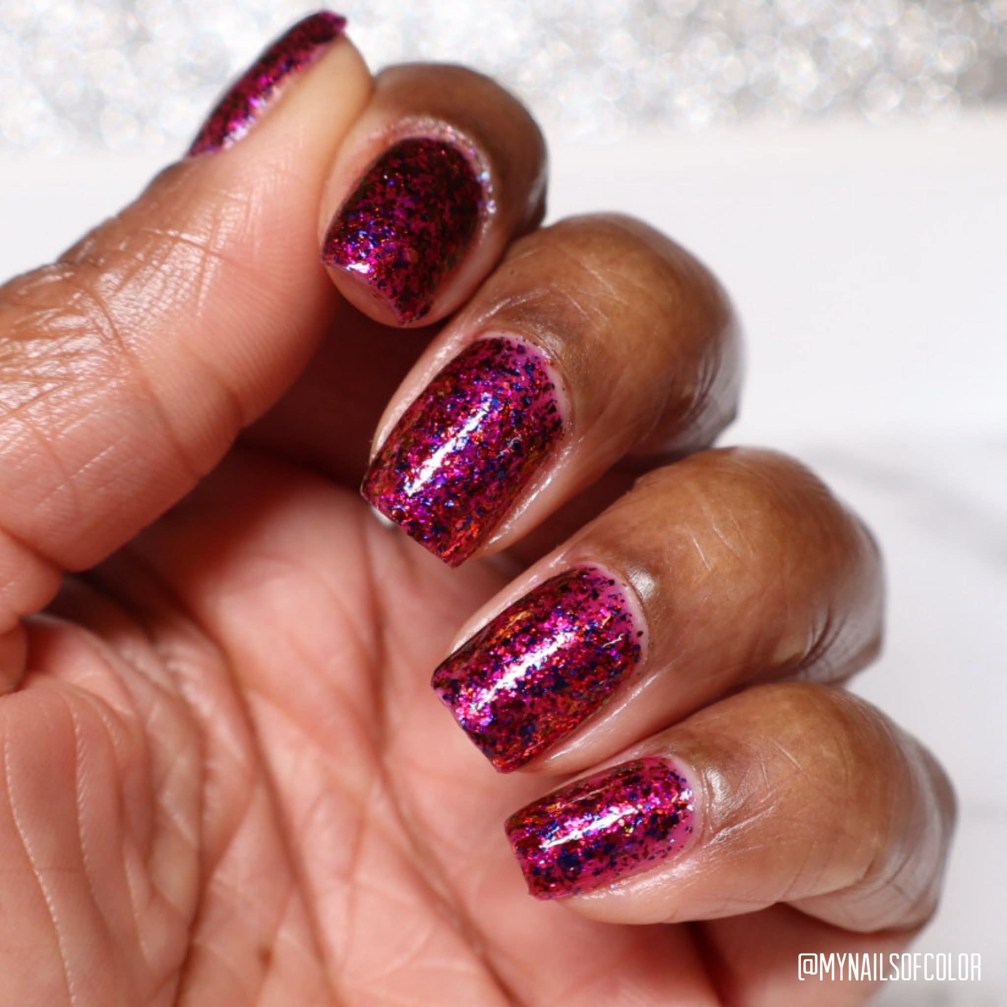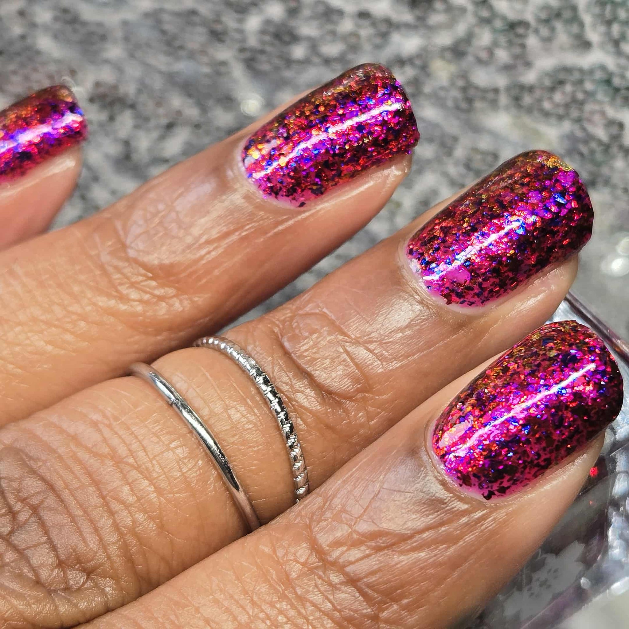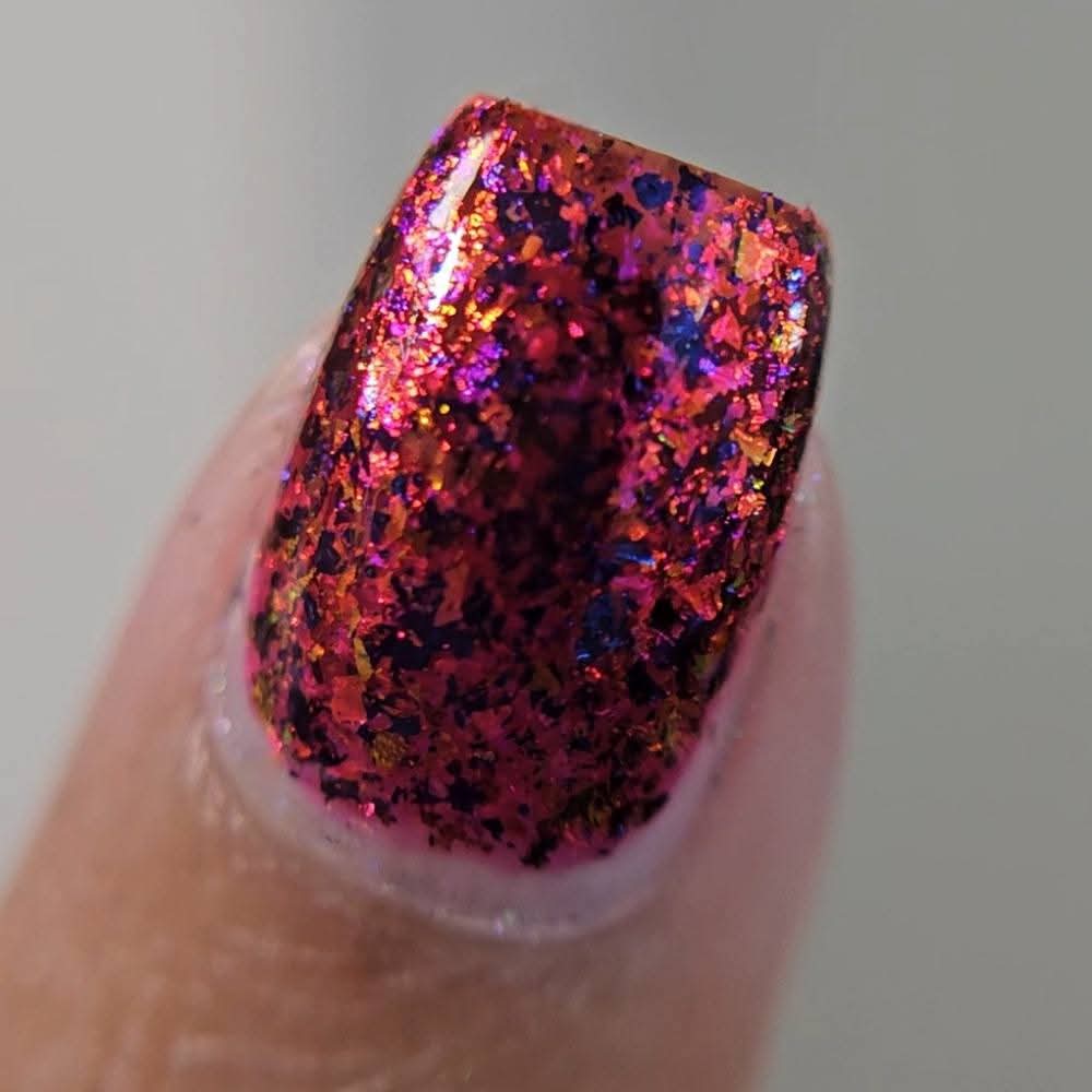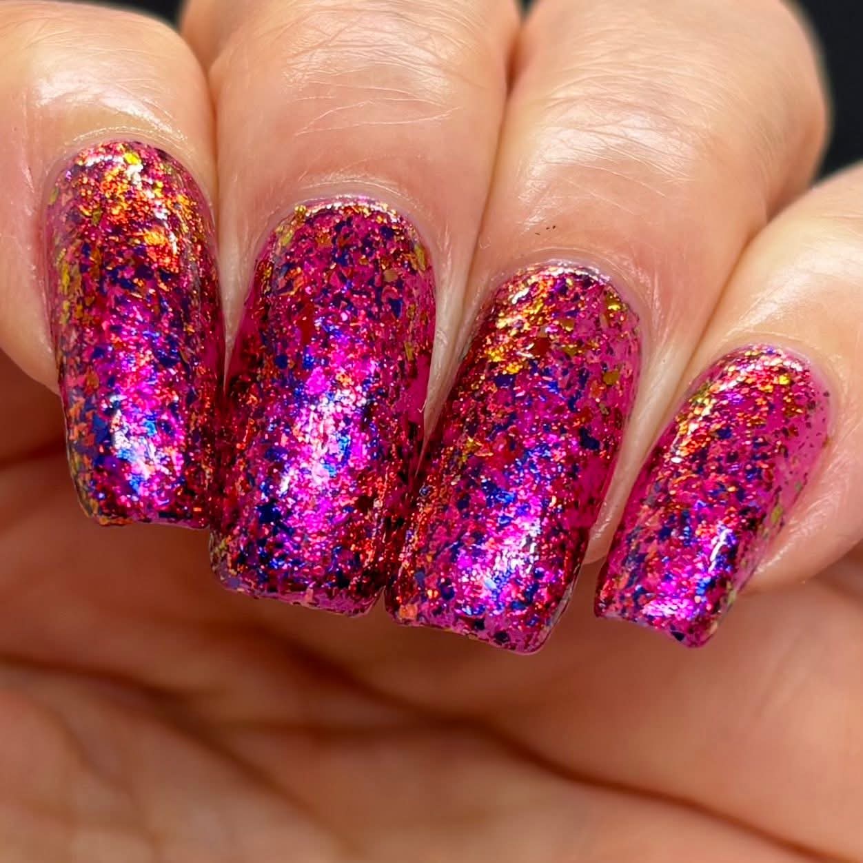 A magenta base with blue/purple UCC flakies, pink/gold crystal flakies, and red/gold UCC flakies.