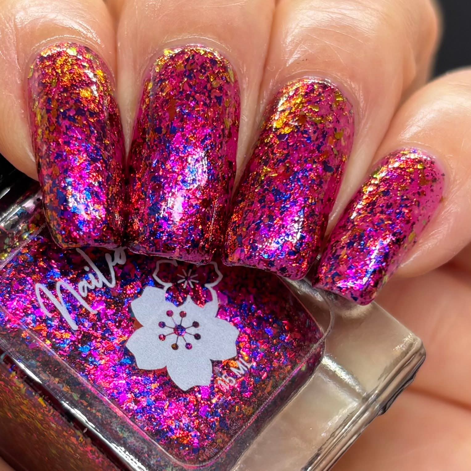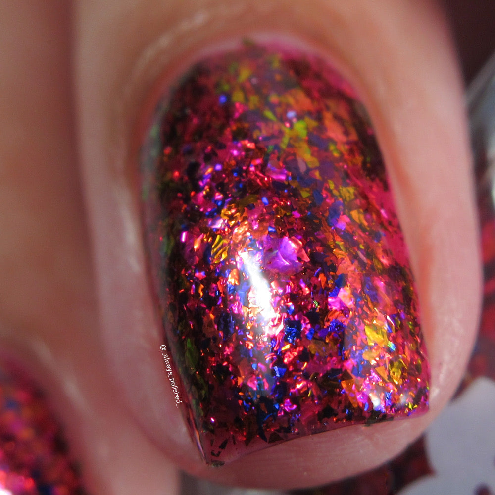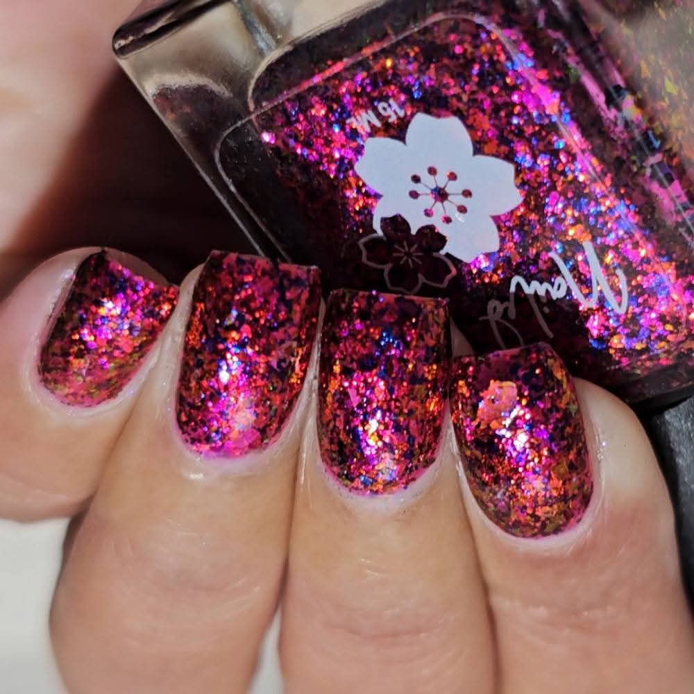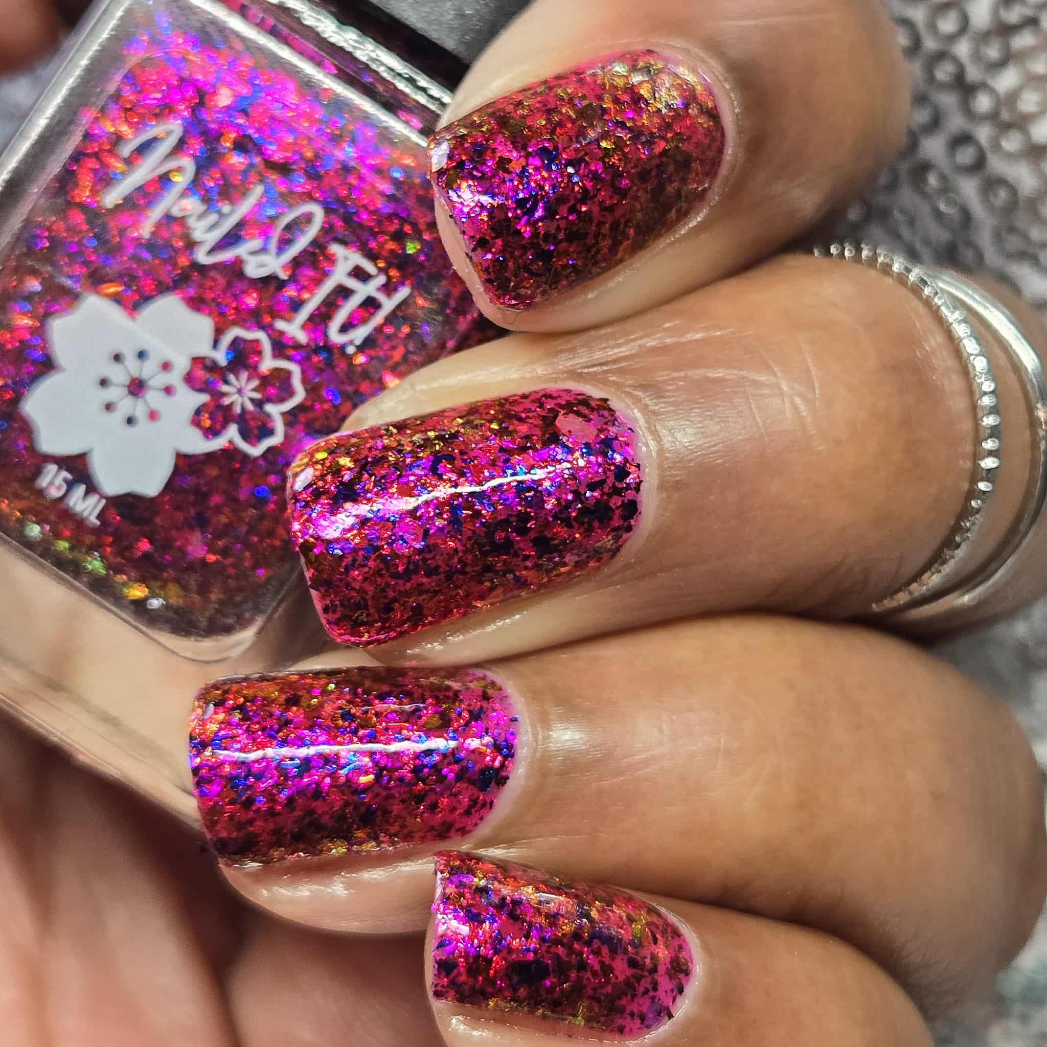 A magenta base with blue/purple UCC flakies, pink/gold crystal flakies, and red/gold UCC flakies.