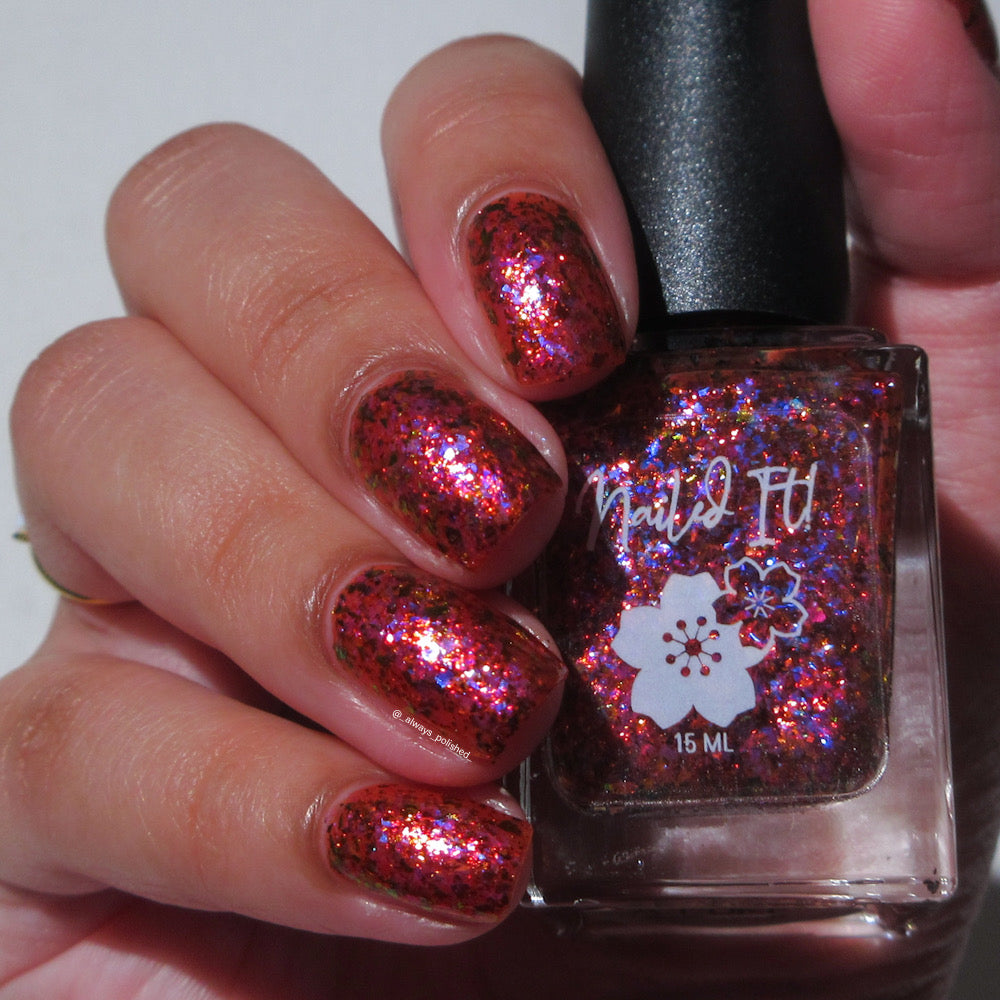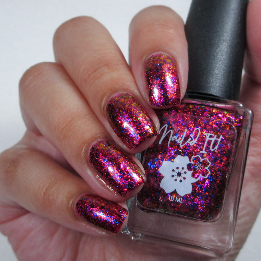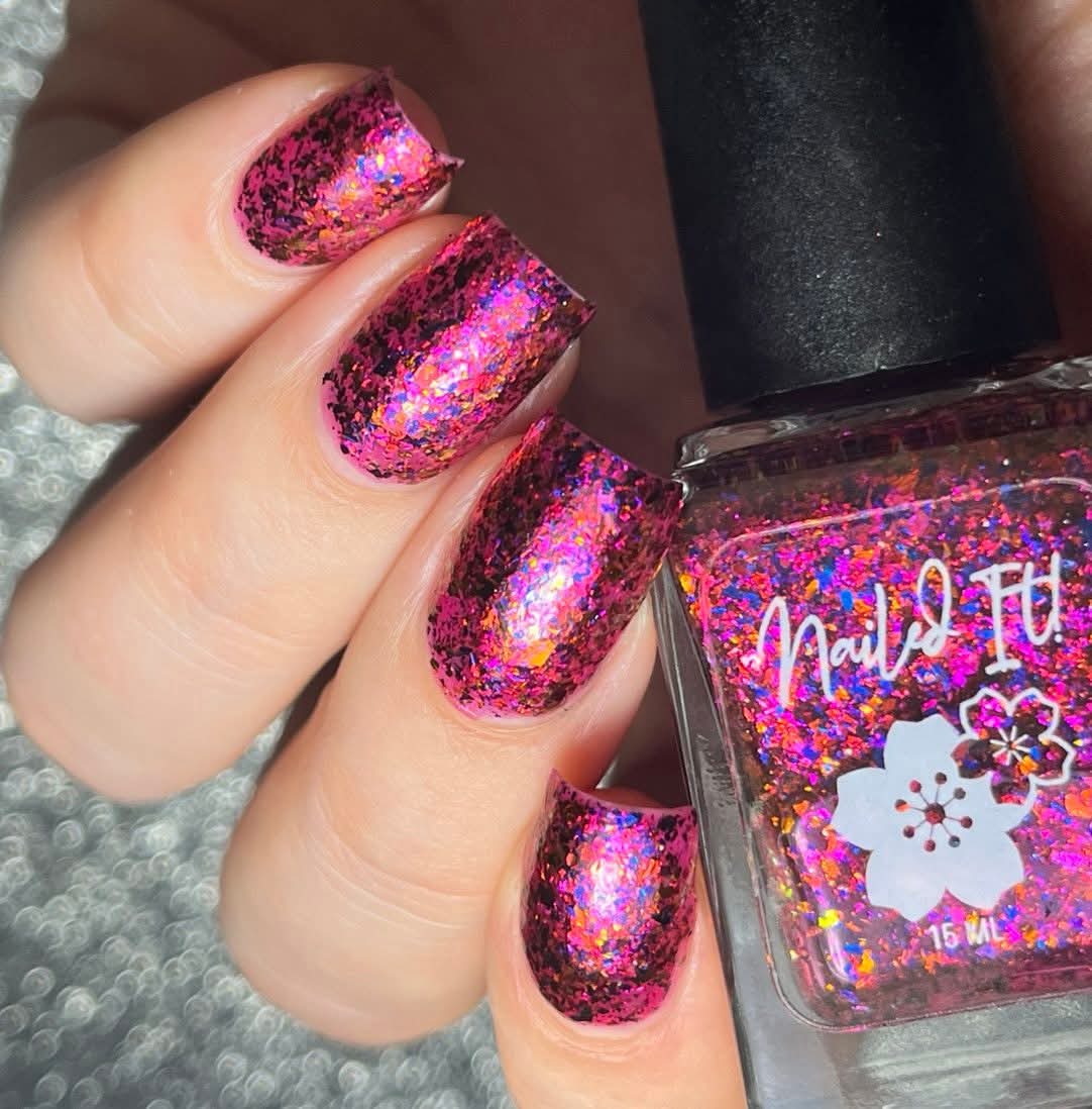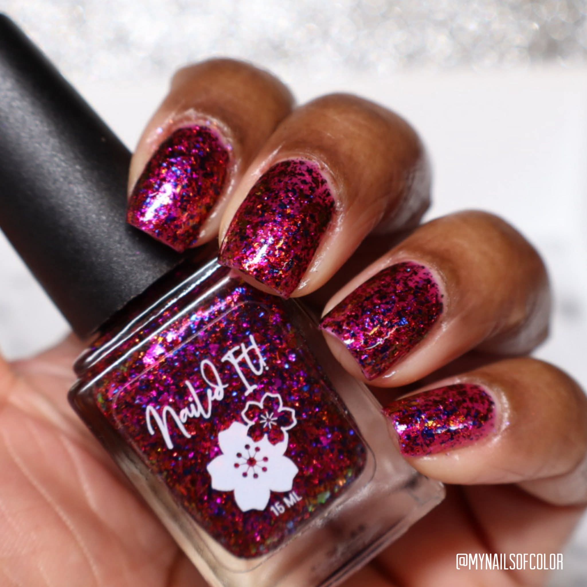 A magenta base with blue/purple UCC flakies, pink/gold crystal flakies, and red/gold UCC flakies.