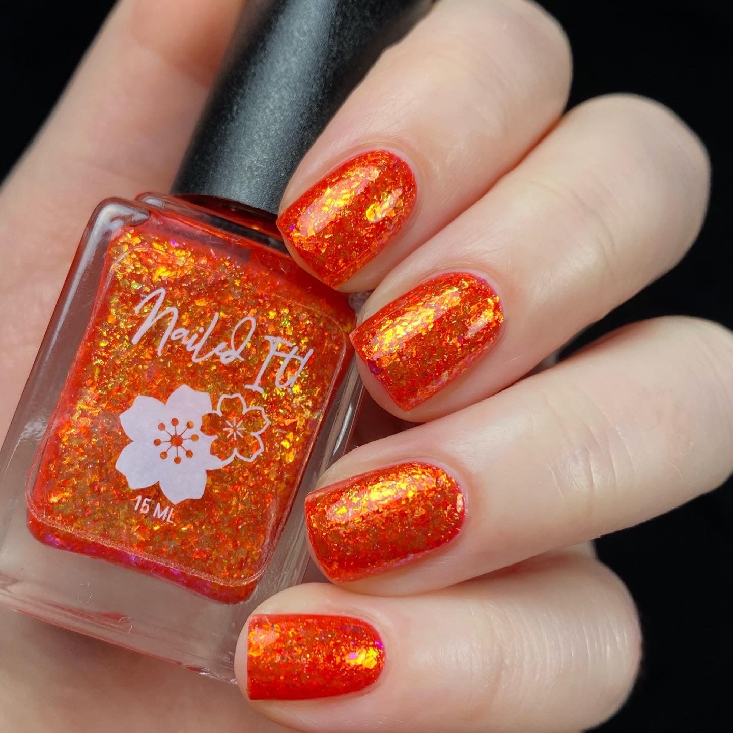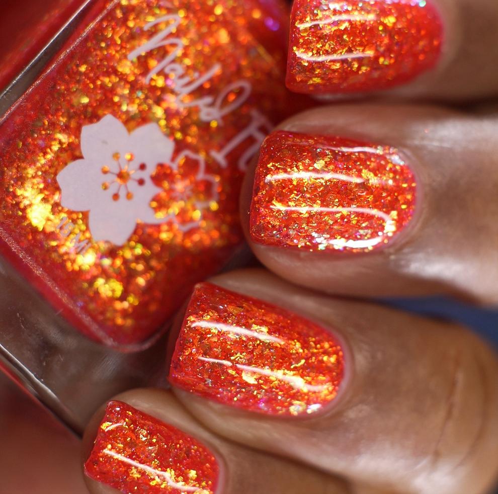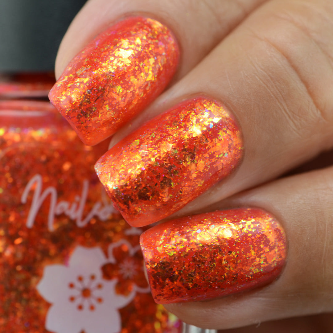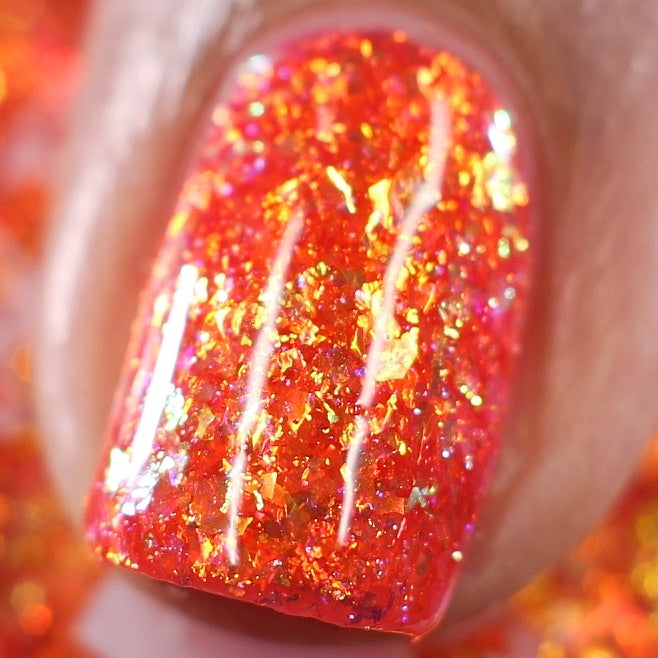 A warm strawberry jelly base packed with gold/copper/green crystal flakies and a touch of holo flakies.