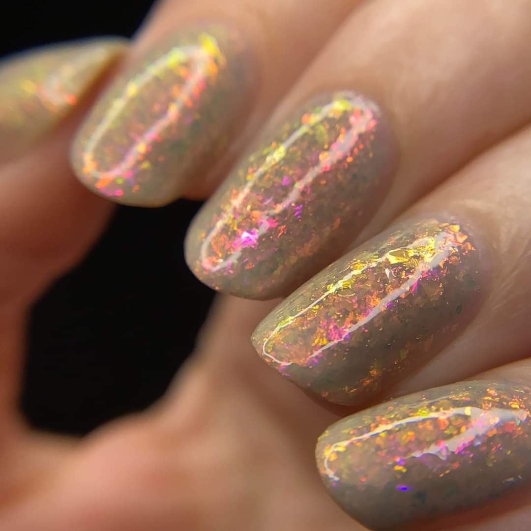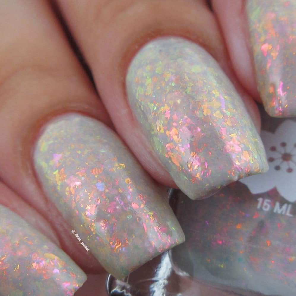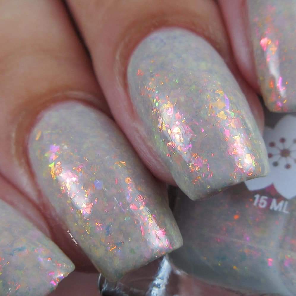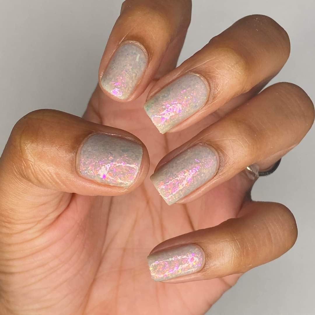 A sheer gray base with pink/violet/gold crystal flakies.