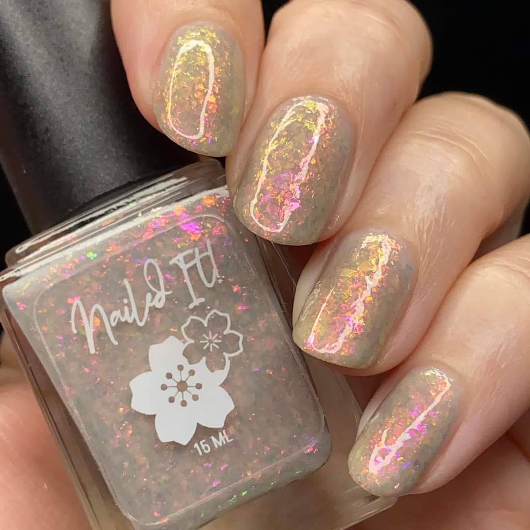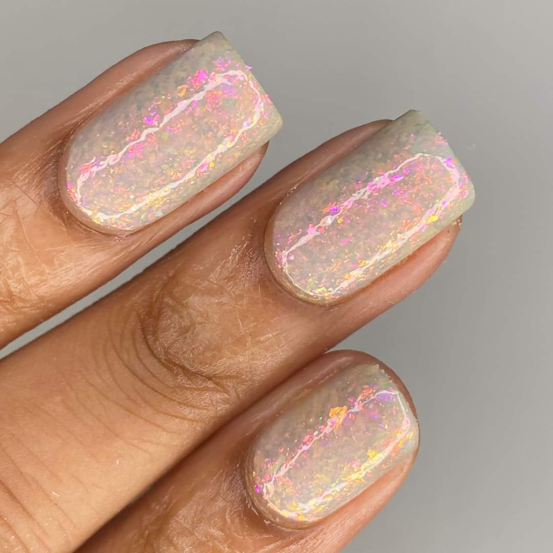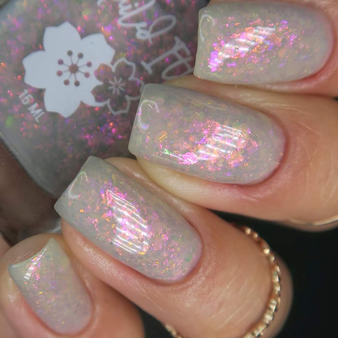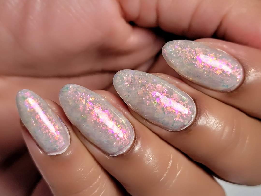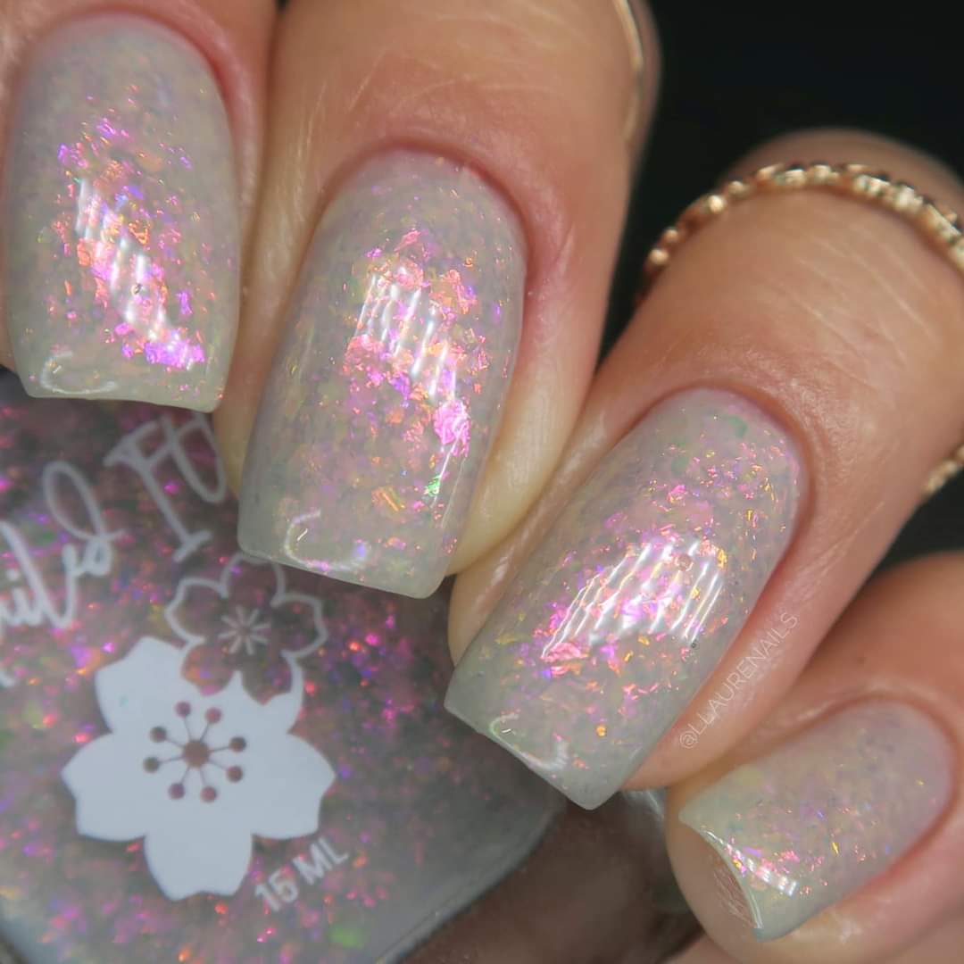 A sheer gray base with pink/violet/gold crystal flakies.
