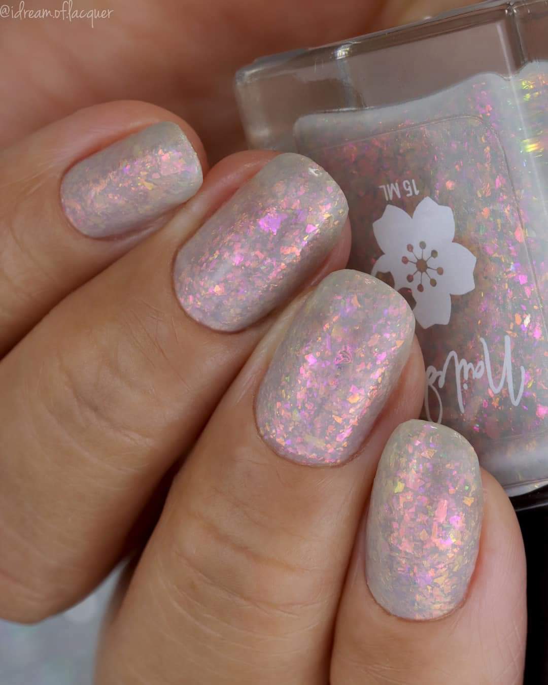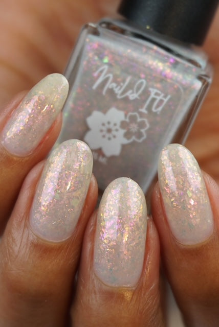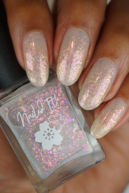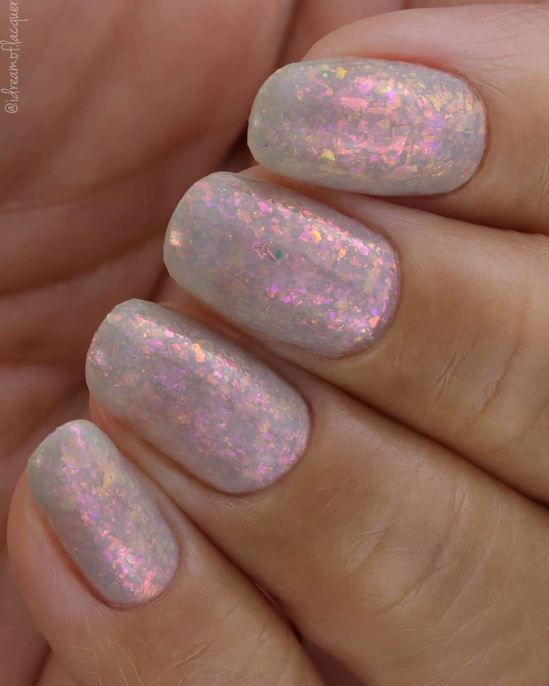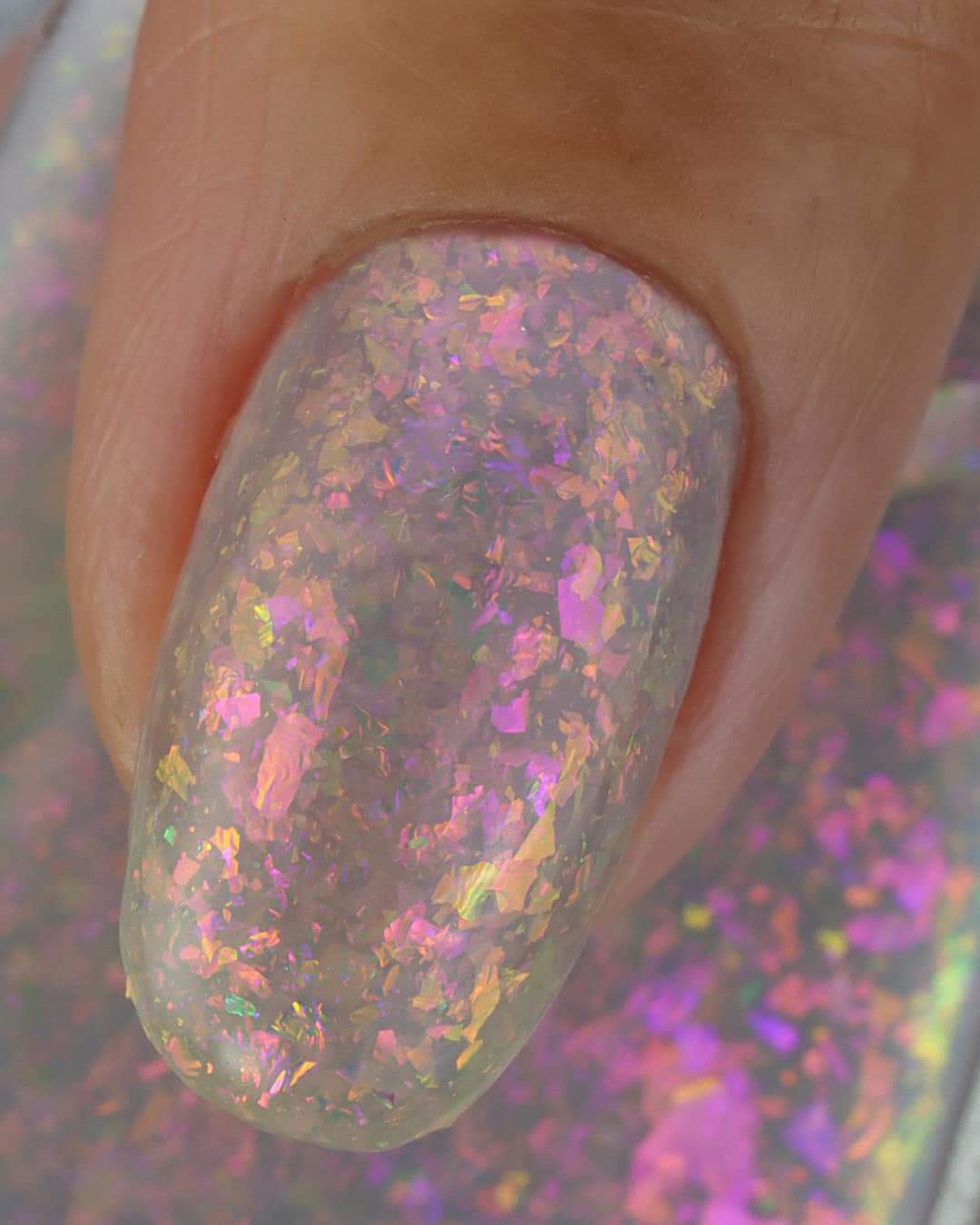 A sheer gray base with pink/violet/gold crystal flakies.