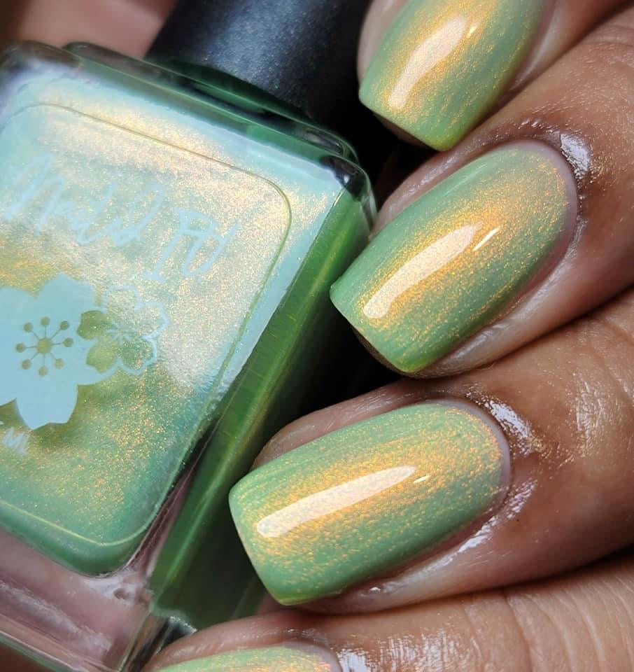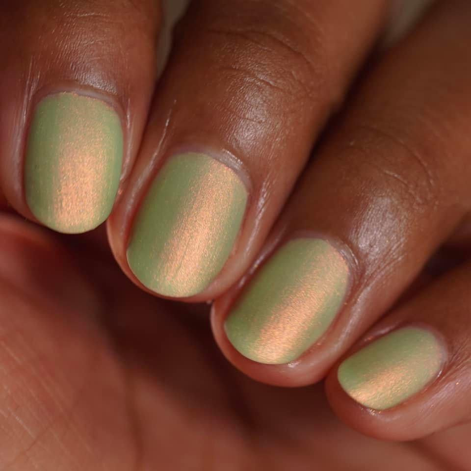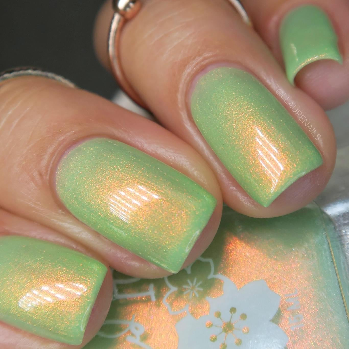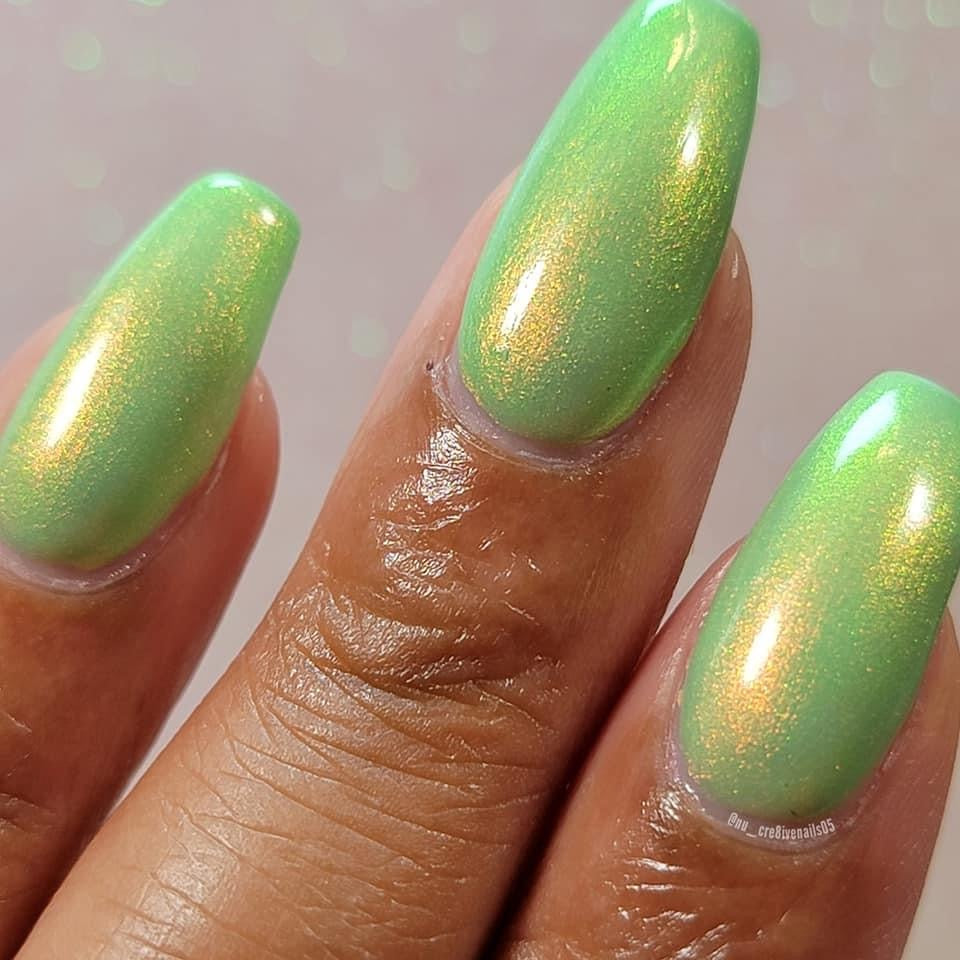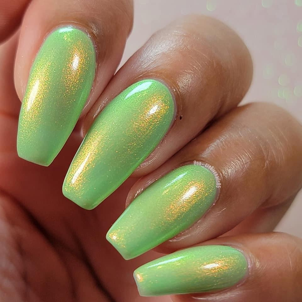 A minty spring green base with a strong red to gold shifting shimmer.