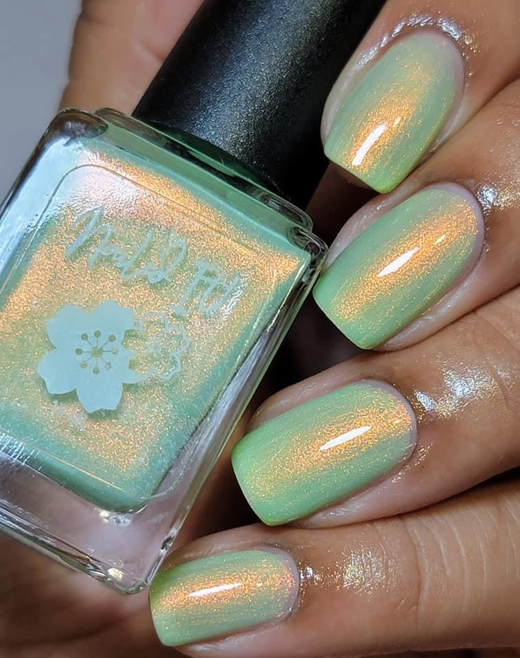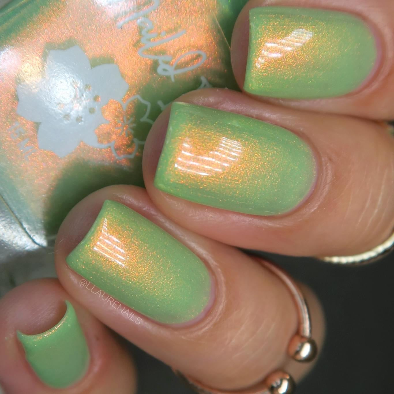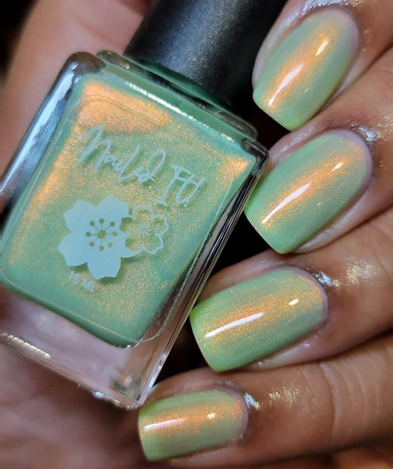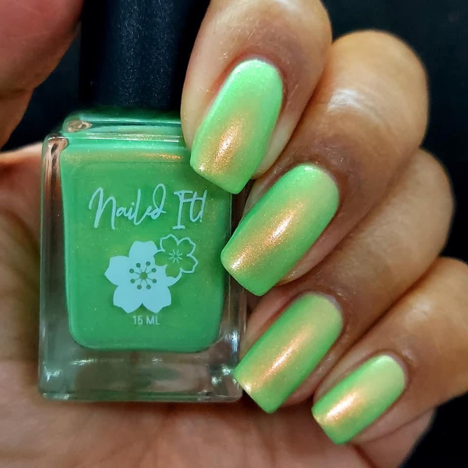 A minty spring green base with a strong red to gold shifting shimmer.