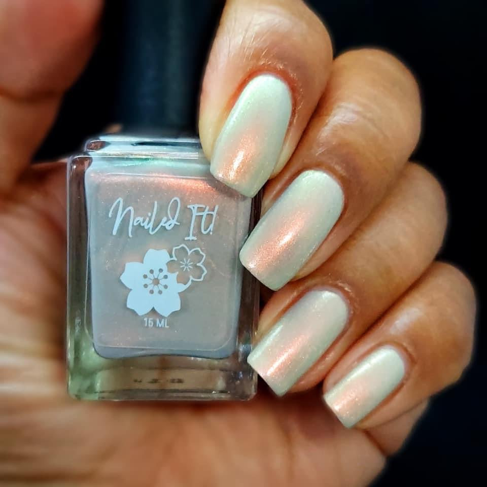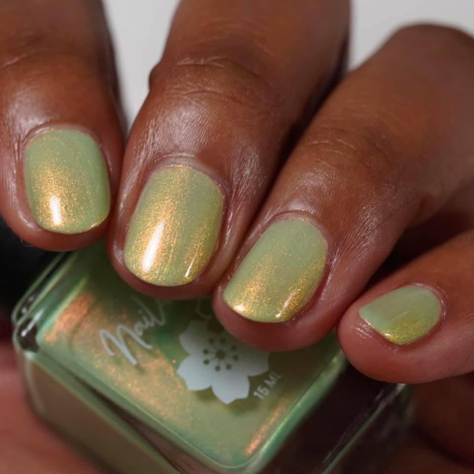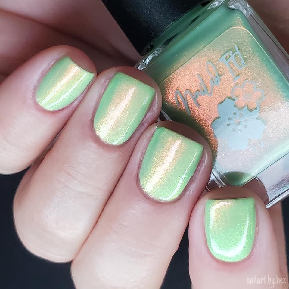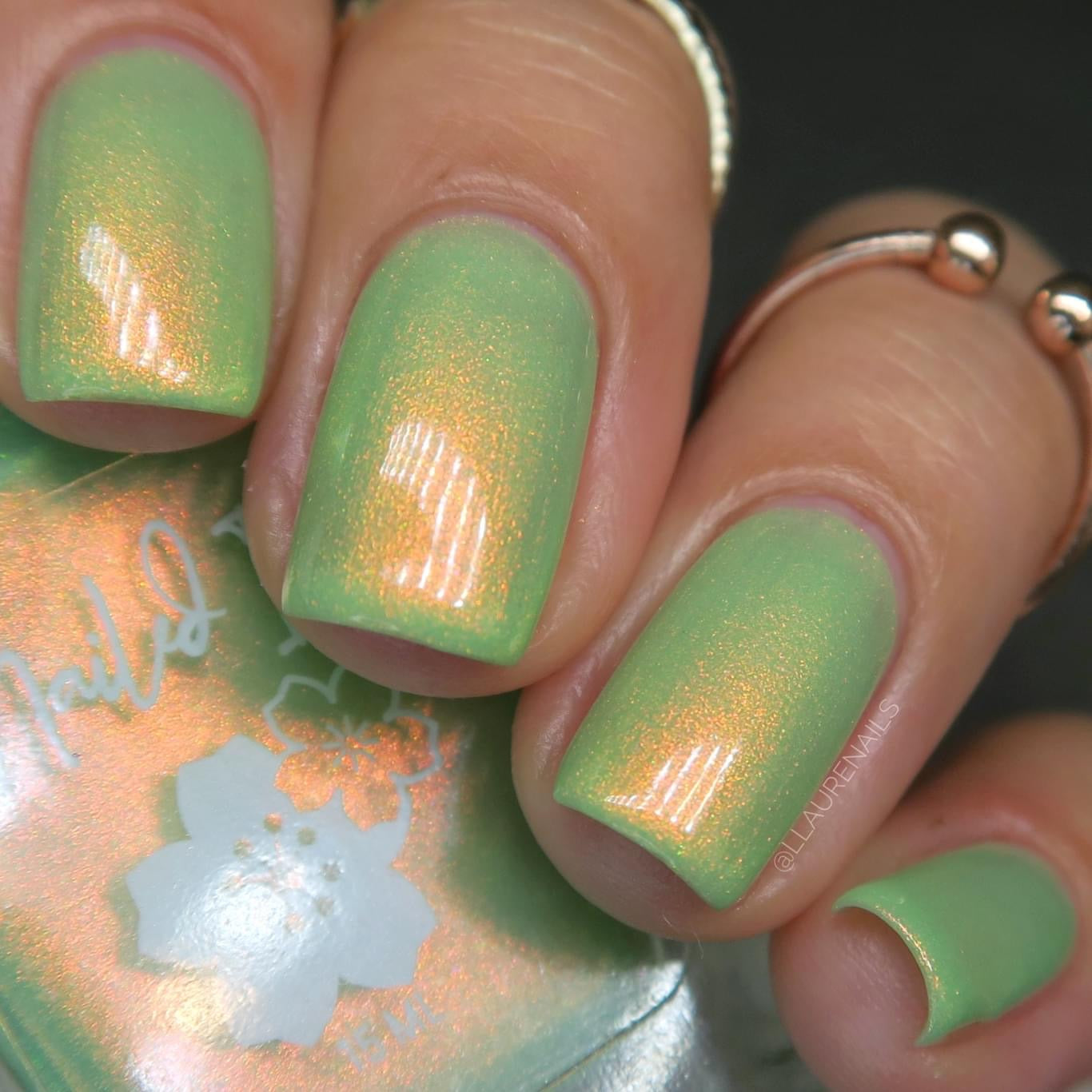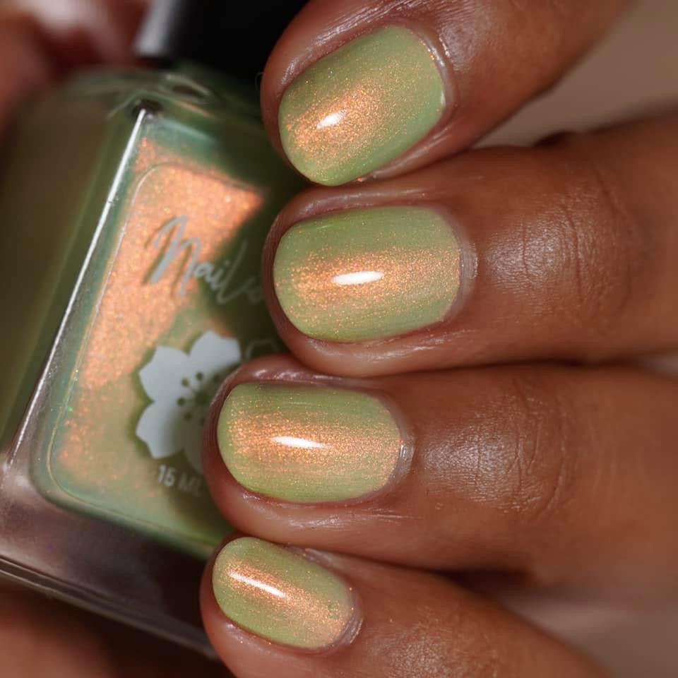 A minty spring green base with a strong red to gold shifting shimmer.