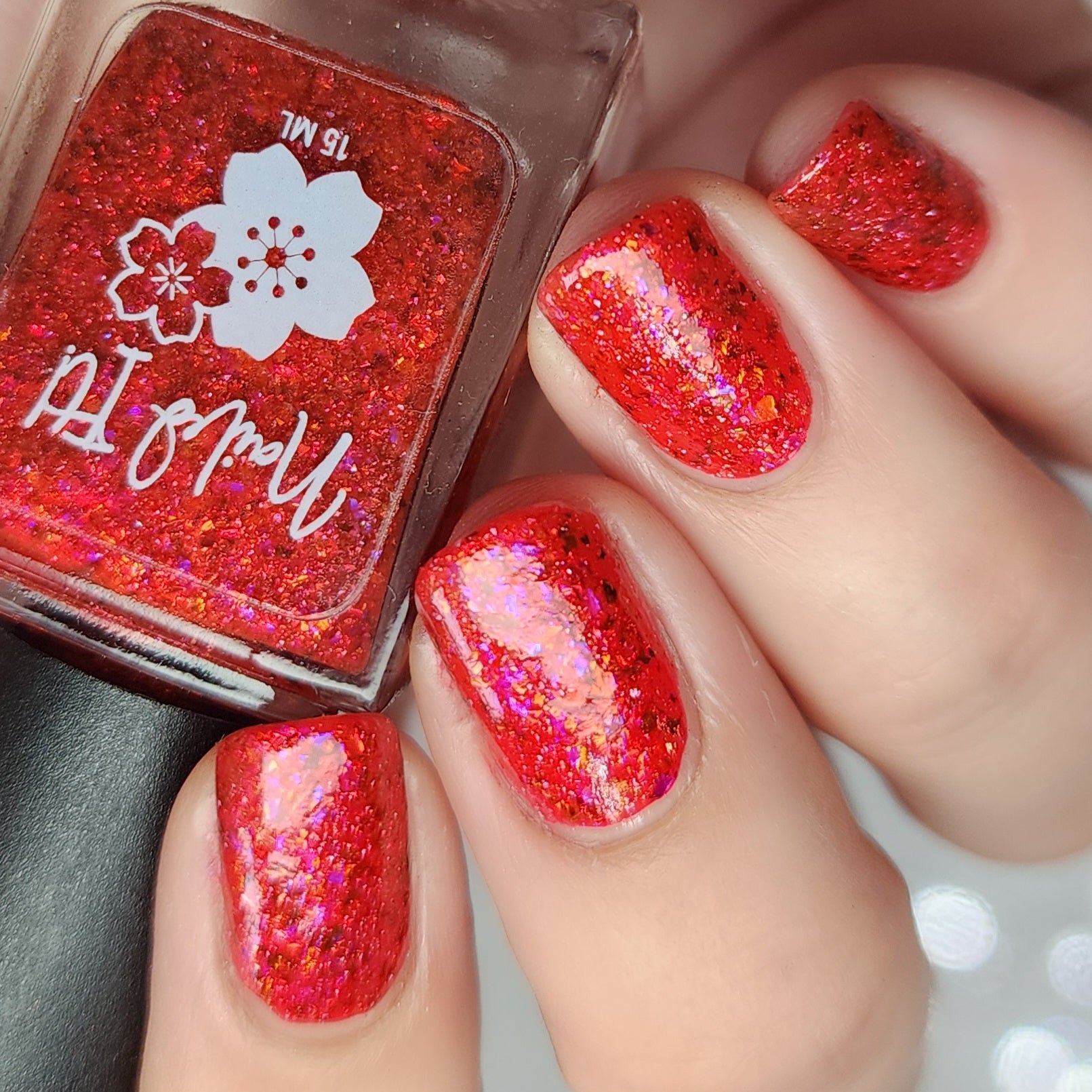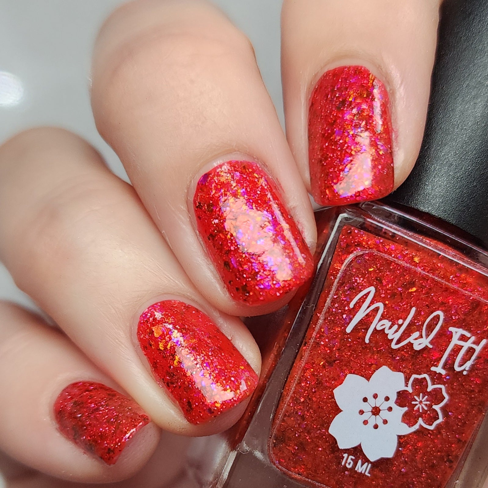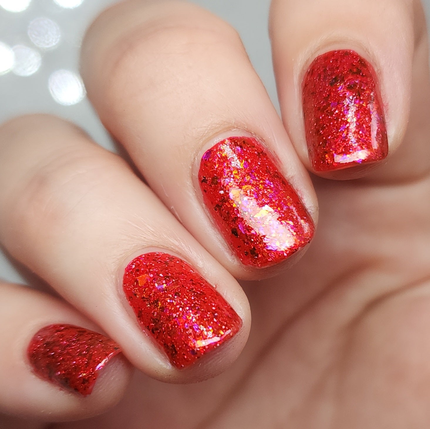 A warm red base accented with red/gold UCC flakies, red/gold crystal flakies, red metallic flakies, pink/purple crystal flakies, and the lightest touch of holo.